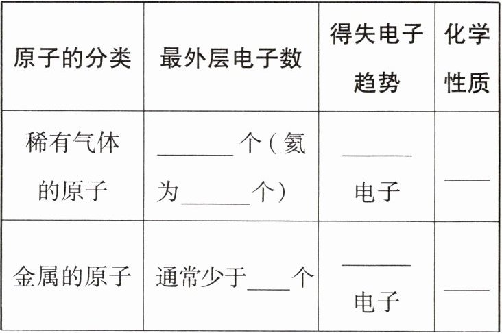 |稀有气体的原子|______个(氦为______个)|______电子|______|