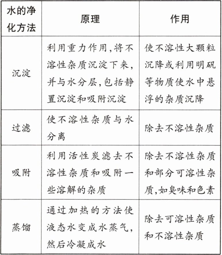 |蒸馏|通过加热的方法使液态水变成水蒸气,然后冷凝成水|除去可溶性杂质和不溶性杂质|