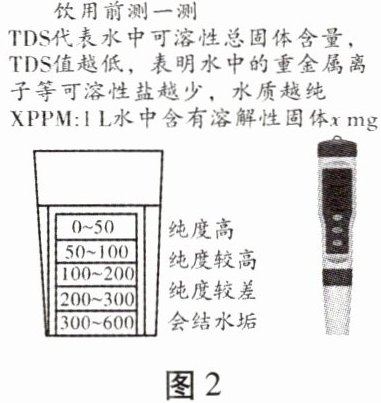 1. 学习完水的净化相关知识后,同学们利用身边常见材料自制图 1 所示的净水器,并利用图 2 所示常见市售水质检测仪检测净化后的水质。下列说法正确的是( )