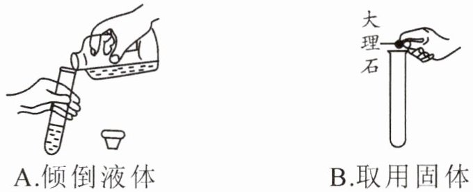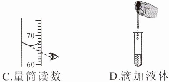 D 【解析】倾倒液体时,瓶塞没有倒放在桌面上,可能会污染瓶塞,从而污染试剂,故A错误。取用块状试剂时,先将试管横放,用镊子夹取块状试剂放到试管口,再把试管慢慢地竖立起来,故B错误。读取液体体积时,视线应与量筒内液体凹液面的最低处保持水平,故C错误。向试管内滴加液体时,应将胶头滴管垂直悬空在试管口的正上方,不能伸入试管内,更不能接触试管内壁,防止污染滴管,故D正确。故选D。