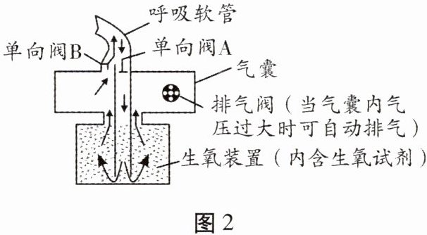 1. 小金设计了一款在缺氧环境或出现高浓度有毒有害气体环境下逃生时使用的自救呼吸器,其设计思路如图1所示,自救呼吸器的结构如图2所示(其中箭头方向表示气体流动方向)。