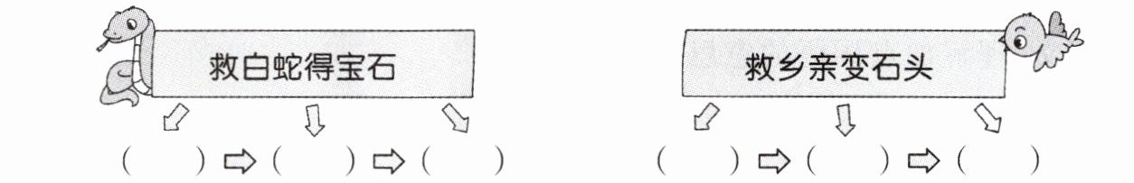 1. 梳理课文的主要情节,按顺序复述,不遗漏重要情节。课文主要讲述了关于海力布的两个小故事,请你在方框里补充小故事,并按照顺序把下列情节填在括号里。(填序号)