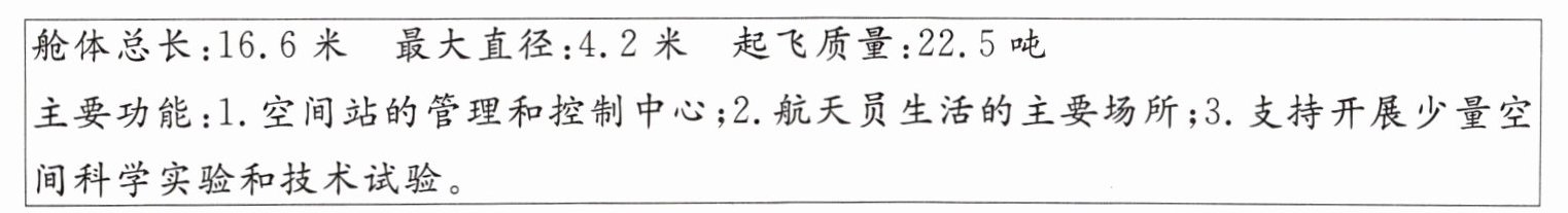 示例:"天和"核心舱是我国目前研制的最大航天器。它全长为16.6米,最大直径为4.2米,发射质量为22.5吨。它是空间站的控制和管理中心,也是航天员生活的主要场所,还可以支持开展少量空间科学实验和技术试验。