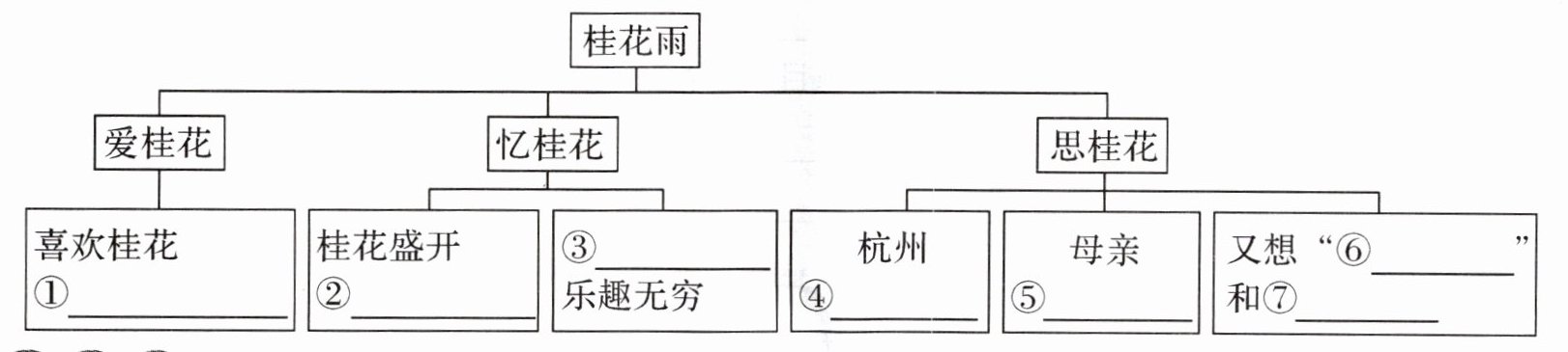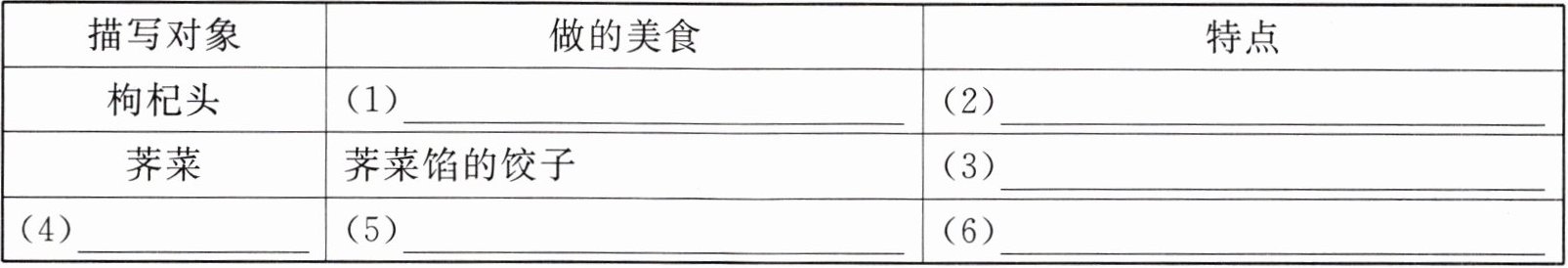 1.(1)枸杞头拌炒鸡蛋皮 (2)色泽碧绿,清香宜人 (3)色如翡翠,鲜美可口 (4)槐花 (5)槐花米饭 (6)糯而不粘,清香四溢 2.读出了小时候“我”想吃妈妈做的荠菜饺子时的急切心情及对饺子的喜爱之情。 3.写儿时挖野菜、吃野菜的情形。 写儿时姐姐带我捋槐花,妈妈做槐花米饭的事情。 4.“桑梓”指故乡。文章题目“找寻桑梓的味道”就是指作者回忆过去关于故乡生活的一幅幅画面,表现了作者对故乡的想念、留恋和热爱。