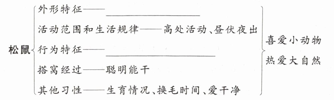 3. 这段话主要写了__________,从__________、__________、__________等方面表现了松鼠__________的特点。