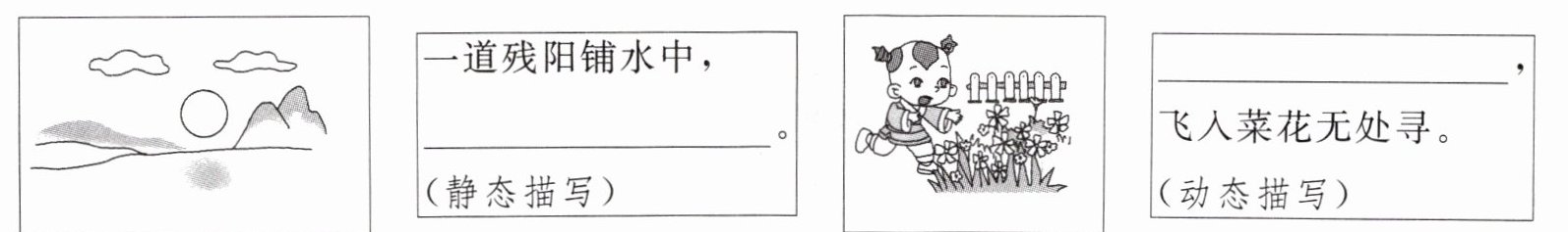五、人们常说“诗是有声画,画是无声诗”,而静态描写和动态描写能使诗句描绘的画面更加动人。请你看图,根据提示把诗句补充完整。