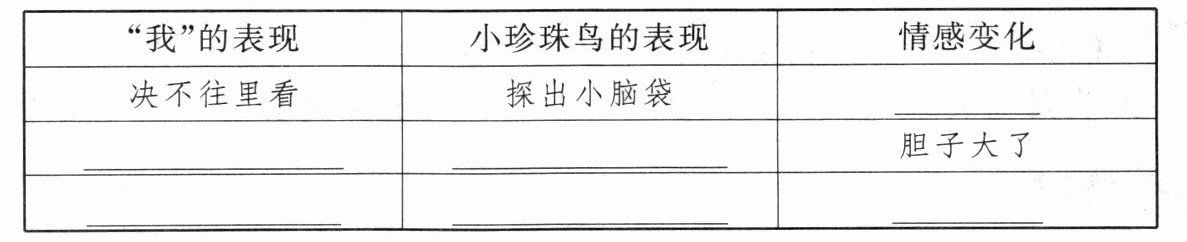 怕人 不去伤害它 啄笔尖、手指 停下笔 睡着了 亲近 思路:关注文中时间和小珍珠鸟活动地点的变化,再从作者和小珍珠鸟的表现来分析,梳理出小珍珠鸟从怕人到信赖人的变化即可。