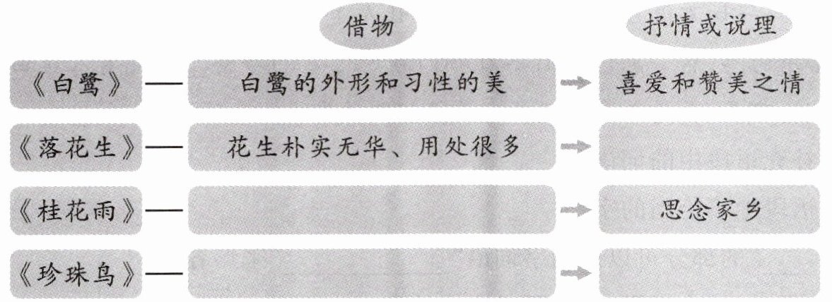 一、本单元的课文都是写事物的,它们或蕴含着作者浓浓的感情,或引发了作者深深的思考。请回忆课文内容,完成填空。