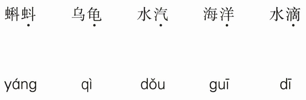 dǒu 对应蝌蚪;guī 对应乌龟;qì 对应水汽;yáng 对应海洋;dī 对应水滴 (以事物顺序对应拼音顺序呈现答案,即按题目事物顺序蝌蚪、乌龟、水汽、海洋、水滴对应答案拼音dǒu、guī、qì、yáng、dī ) 。