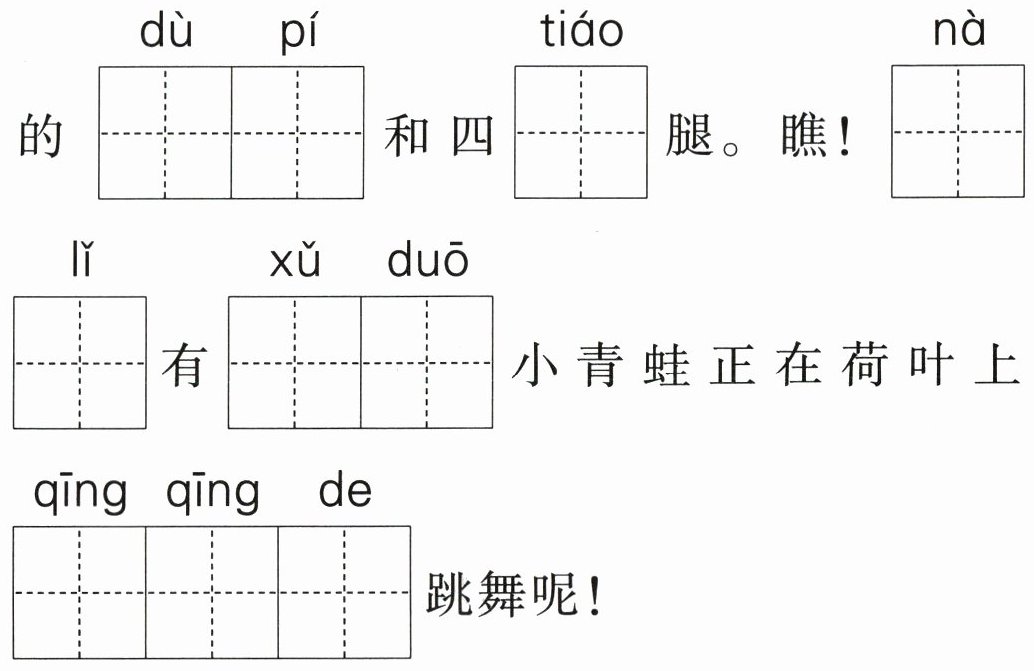 1. 根据提示写出小青蛙的样子。看拼音,写字词。(12 分)