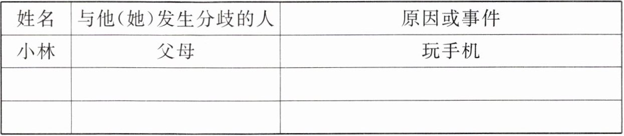 结合本课中篮球赛和下象棋的案例,了解并在下表中记录你自己或者身边的人和他人发生分歧的原因或事件。
