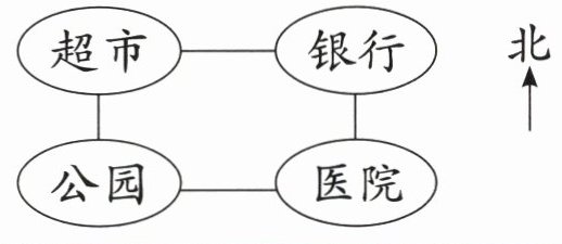 超市在公园的( )面,在银行的( )面。医院的北面是( )。公园的东面是( )。