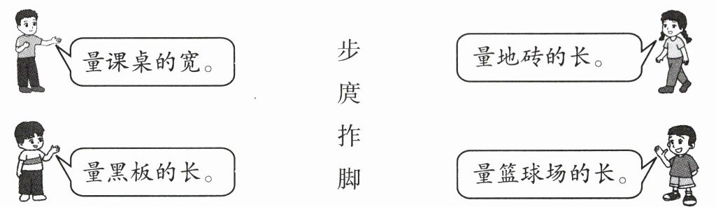 量课桌的宽—拃;量地砖的长—脚;量黑板的长—庹;量篮球场的长—步