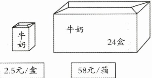 【解析】:A超市:28-24=4(盒),58+4×2.5=58+10=68(元);B超市:买1箱送2盒,24+2=26(盒),28-26=2(盒),62+2×2.6=62+5.2=67.2(元);68>67.2,在B超市买便宜,需要67.2元。