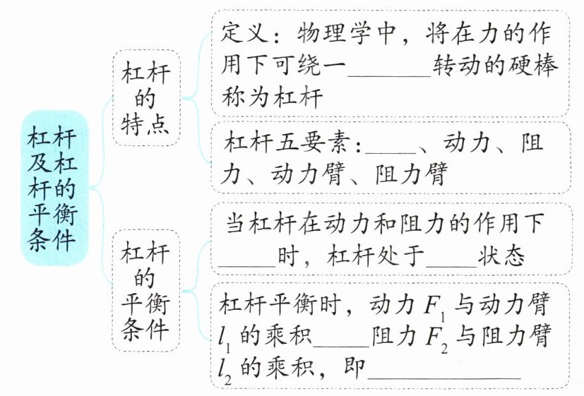 1. 在力的作用下绕固定点转动的硬棒称为______。杠杆绕着转动的点叫______,通常用______表示。使杠杆转动的力叫______,阻碍杠杆转动的力叫______。从支点到动力作用线的距离叫______,从支点到阻力作用线的距离叫______。