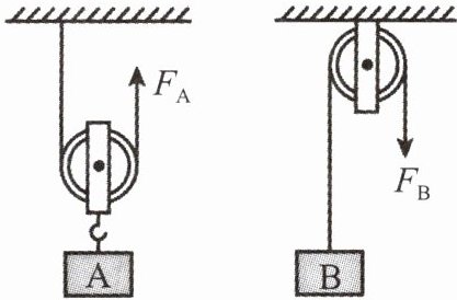 7. (2024·陕西西安月考)如图所示,用不同的滑轮提升重均为$100N$的物体,不计滑轮的重力、绳重和摩擦。拉动$A$物体的是______滑轮,拉动$B$物体的滑轮相当于______杠杆,$F_A = $______,$F_B = $______。[img]