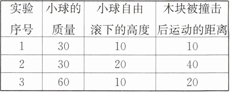 | 实验序号 | 小球的质量 | 小球自由滚下的高度 | 木块被撞击后运动的距离 |