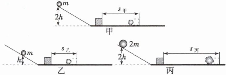 (3)比较甲和丙两组实验可知,小球滚下的高度相同,到达水平面时的速度相同,小球的质量不同,质量越大,推动木块移动的距离越远,动能越大,可以探究动能大小与质量的关系,故结论为:物体速度相同时,质量越大,动能越大。