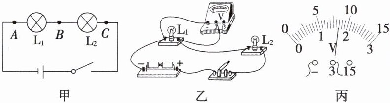(2)正确安装后,测量 $ AB $ 两端电压,电压表示数如图丙所示,则 $ U_{AB} = $____V。接下来小明将电压表 $ A $ 点的导线直接改接到 $ C $ 点,测量 $ BC $ 两端的电压,小明的做法是____(选填“正确”或“错误”)的,原因是____;