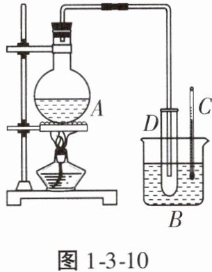 11. 如图1-3-10所示的装置中,A为盛水的烧瓶,B容器中装有适量的冷水,C为温度计,D为试管(C和D的夹持装置已略),玻璃导管由烧瓶A通入试管D中。对烧瓶加热并使其中的水沸腾,隔一段时间会看到试管D的管壁上有
