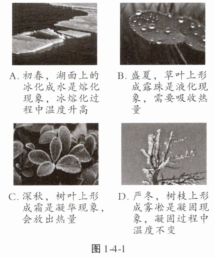 C 【解析】初春,湖面上的冰化成水,固态变为液态,是熔化现象,冰是晶体,冰熔化过程中温度不变,故A错误;盛夏,草叶上的露珠是水蒸气液化形成的,液化放热,故B错误;深秋,树叶上的霜是水蒸气直接凝华形成的,凝华放热,故C正确;严冬,树枝上的雾凇是水蒸气直接凝华形成的,凝华放热,故D错误。