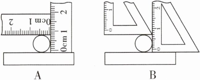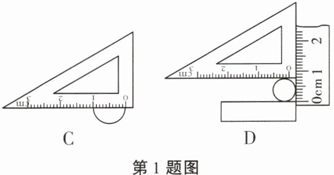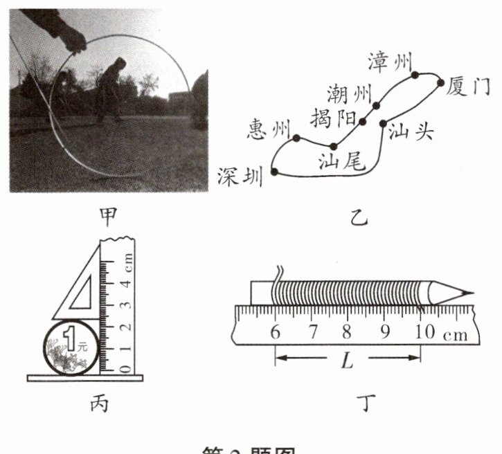 2.C【解析】轮子的周长可以测出,要测量操场的周长,可以先记下轮子转过的圈数n,再乘轮子的周长L即可,故A正确;测量铁路线长度时,可用一根无弹性的棉线和地图上的铁路线重合,测出重合的棉线长度,再按比例进行换算即可得出,故B正确;图中使用三角板和刻度尺测纪念币的直径时,纪念币的一端没有与刻度尺的零刻度线对齐,故C错误;金属丝的直径太小,甚至小于刻度尺的分度值,无法直接准确测量,所以可以把金属丝无间隙地在一根铅笔上密绕若干圈,测出密绕部分的长度L和圈数N,则直径D=$\frac {L}{N}$,故D正确。