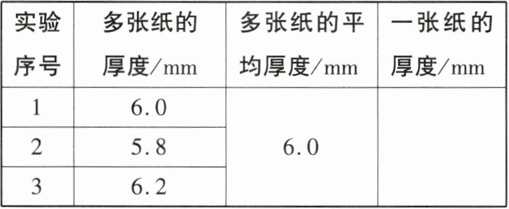 3.减小误差 0.1【解析】该实验中多次测量取平均值的目的是减小误差。纸张的张数$n=\frac {120}{2}=60$,一张纸的厚度$L_{0}=\frac {L}{60}=\frac {6.0mm}{60}=$0.1 mm。