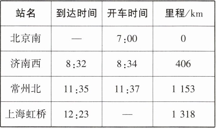8. 观察题中的列车时刻表,计算列车从北京南站到上海虹桥站的里程为