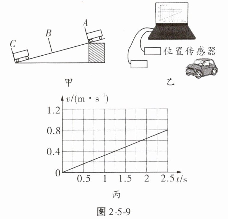 (选填“A”或“B”)处静止释放,并在B处开始计时,在C处停止计时。(3)物体运动的情况还可以通过另一种办法即时测定、显现出来。如图2-5-9乙所示,位置传感器利用超声波测出不同时刻小车与它的距离,计算机就可以算出小车在不同位置的速度。屏幕图像如图2-5-9丙所示,横轴为时间,纵轴为速度,通过图像可以看出小车在斜面上滑下时是