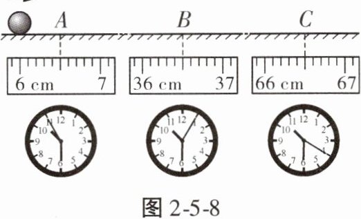 8. 两个同学用下面的方法来测量小钢球运动的平均速度。在水平桌面上的一条直线上标出A、B、C三个点,拿一根分度值为1mm的米尺紧靠直线,A、B、C三点在米尺上对应的示数如图2-5-8所示。当小钢球贴着米尺运动经过A、B、C三点时,两同学用手表记下了小钢球经过A、B、C三点时对应的时刻,则小钢球在通过AB、BC和AC各段路程中的平均速度分别为$\overline{v}_{AB}=$