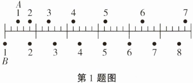 1. 如图为两个小球运动过程的频闪照片,闪光时间间隔为$1s$,图上数字为闪光时刻编号,图中每一个小格的长度为$0.2m$,请按提示描述这两个小球的运动。