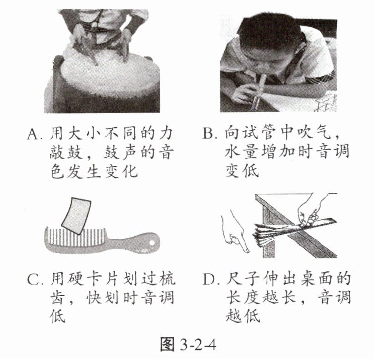 )A.用大小不同的力敲鼓,鼓声的音色发生变化