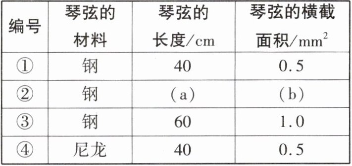 (2)为了验证猜想二,即琴弦发出声音的音调可能与琴弦的长短有关,应控制琴弦的材料与横截面积相同,只改变琴弦的长度;为了验证猜想三,即琴弦发出声音的音调可能与琴弦的横截面积有关,应控制琴弦的材料与长度相同,则表中缺少的数据应为(a)40,(b)1.0[或(a)60,(b)0.5]。