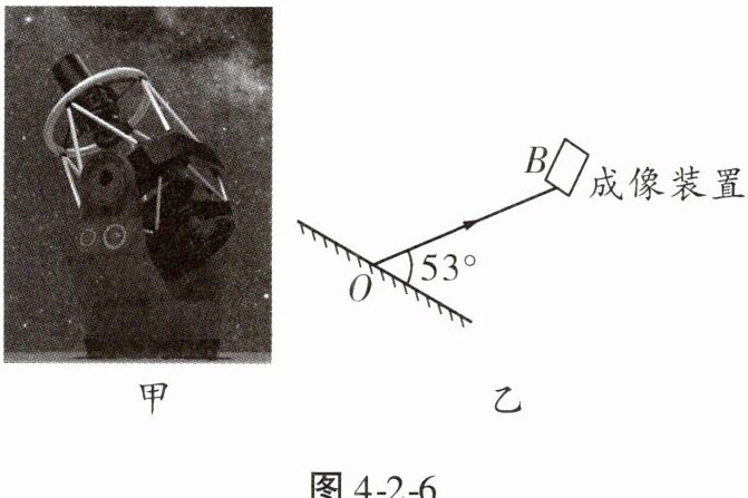 7. (2024南充中考,新科技)2023年9月17日,我国墨子巡天望远镜正式启用,它是北半球巡天能力最强的光学时域望远镜,如图4-2-6甲所示。一束星光入射到望远镜,经主镜反射后到达成像装置,如图4-2-6乙所示,OB是反射光线。请画出其入射光线AO并标出入射角大小(保留作图痕迹)。