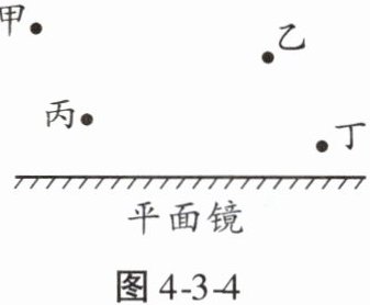 2. 舞蹈教室内有一面非常大的平面镜,一位同学先后站在镜前甲、乙、丙、丁的四个位置,如图4-3-4所示。关于他在平面镜中所成像的特点,下列描述中正确的是(