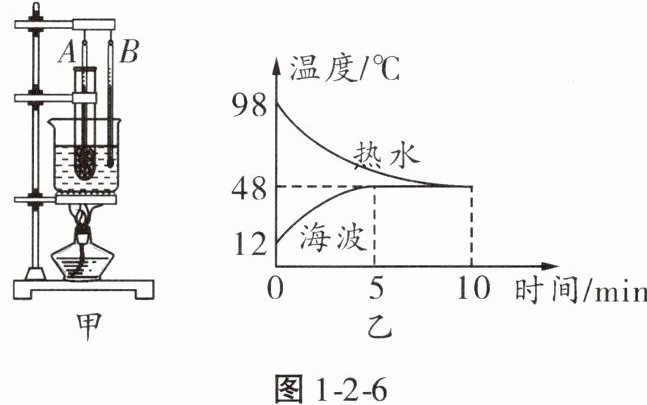 10. (科学探究)在做“海波熔化”的实验时,某小组采用图1-2-6甲所示的实验装置,将装有海波的大试管放入沸水中并取走酒精灯,温度计A和B分别测量海波和烧杯中热水的温度。根据两个温度计的示数,绘制出了海波和热水的温度随时间变化的图像,如图1-2-6乙所示。由图像可知,在第7min时,大试管内的海波处于