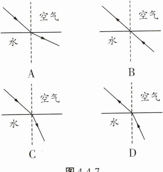 9. 如图4-4-7所示,能正确说明“水中的潜水员看见岸上树梢位置变高的原因”的光路图是(