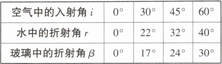 14. 在“探究光的折射规律”实验中,某组同学将光分别射入水和玻璃中,记录数据如下表所示。