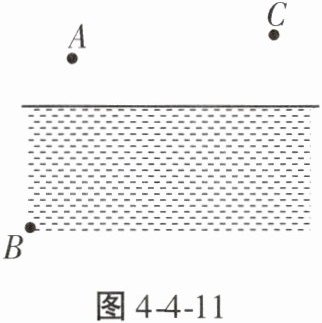 13. 平静水面上方的小鸟和水中的小鱼在某时刻的实际位置A、B如图4-4-11所示,C点的人恰好看到它们在水中的像A'、B'重合。请画出小鸟在水中像的位置和人眼看到小鱼的光路图。