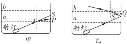 B 【解析】往池内注水,水面升至a位置时,发生折射,根据折射角大于入射角画出折射光线,人看到亮斑的位置P点如图甲所示。水面升至b位置时,光在水中沿直线传播,经水池侧壁反射后,光从水中斜射向空气中,折射角大于入射角,折射光线远离法线,折射光线的反向延长线与侧壁的交点,即人看到亮斑的位置Q点在S点的上方,如图乙所示。由此可知B正确。