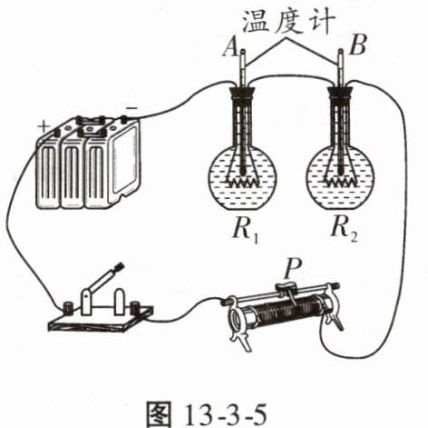 4.利用图13-3-5所示的装置探究“导体产生的热量与电阻大小的关系”。两个相同的烧瓶内装着等质量且初温相同的煤油,煤油中各浸泡着一段电阻丝,通电一段时间后,发现A瓶内温度计的示数低于B瓶,则电阻$R_1$