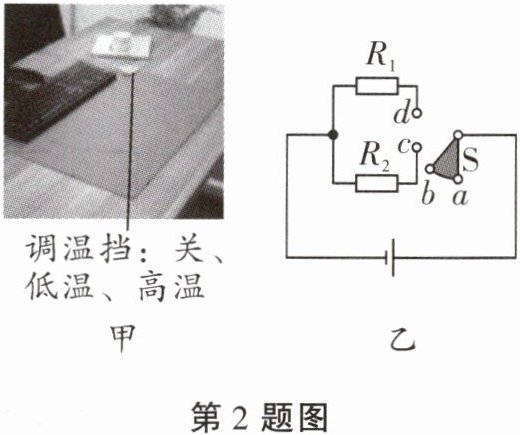 2. 如图甲所示为某款电热桌垫,查看其说明书发现:该电热桌垫由$24\ V$电源供电,发热部分由$R_{1}$、$R_{2}$两根电热丝组成,通过调温开关调整不同的挡位,其原理电路如图乙所示。已知电热桌垫处于高温挡时功率为$84\ W$,$R_{2}$为$48\ Ω$,不考虑温度对电阻的影响。求: