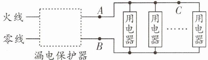13. 如图13 - 4 - 13所示是安装了漏电保护器的家庭电路。当漏电保护器检测到通过图中A和