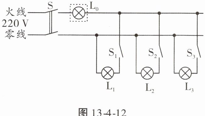 12. 电工师傅常用一只额定电压为220V的灯泡$ L_0 $(检验灯泡)取代保险丝来检查新安装的照明电路中每条支路的情况。如图13 - 4 - 12所示,当S闭合后,再分别闭合$ S_1 $、$ S_2 $、$ S_3 $(每次只能闭合其中之一)时,下列判断正确的是(