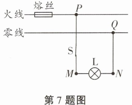 7. 如图所示,闭合开关 $ S $,发现灯 $ L $ 不亮,用试电笔接触 $ P $ 点时氖管发光,而接触 $ M $、$ N $、$ Q $ 点时氖管均不发光。若电路中仅有一处故障,则该故障是 (