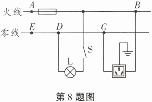8. 小李早上想用电热水壶烧开水,将插头插入插座,并闭合开关,发现电热水壶不工作,厨房的灯泡也熄灭了。他保持灯泡开关闭合,拔出电热水壶插头,用试电笔分别接触图中插座的左右两孔,发现接左、右孔时氖管均发光。若电路中只有一处故障,则故障可能是 (