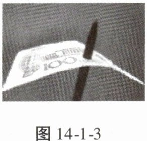 4. 如图14-1-3所示,一张百元钞票好像被一支笔“戳穿”了。实际上这张钞票依然完好无损,这里应用了磁现象的有关知识。原来,这支笔的笔杆(纸币的下方)与笔头(纸币的上方)可以互相分离,笔杆与笔头相连的一端内部装有磁体,则笔头内的材料可能含有