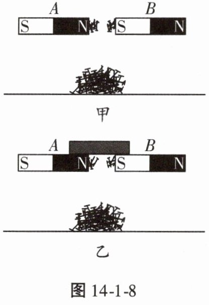 11. 如图14-1-8甲所示,桌面上放有一定量的铁钉,将两根完全相同的条形磁体A和B,放置在靠近铁钉的上方并吸附一定量的铁钉。现用一根长度略大于两磁体间距的软铁棒将两磁体连接起来,如图14-1-8乙所示,则被吸附的铁钉会