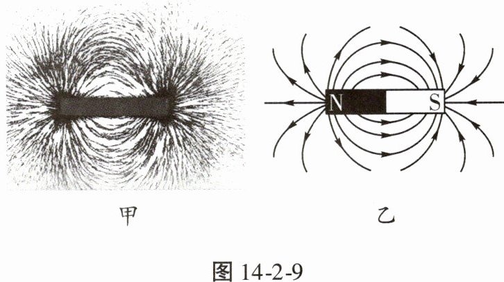 6. 如图14-2-9甲所示,铁屑在条形磁体周围有规律地分布着。磁体两端的铁屑比较密,说明其磁性