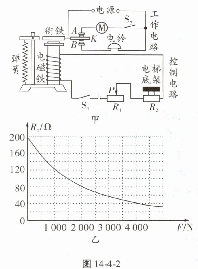 【典例2】小明设计了一个电梯自动报警模拟装置,如图14-4-2甲所示。在控制电路中,电源电压为12 V,$R_1$为滑动变阻器,$R_2$为压敏电阻,$R_2$的阻值大小随压力F的变化关系如图14-4-2乙所示。闭合开关$S_1$和$S_2$,当压敏电阻受到的压力达到4000 N时,电磁铁线圈中的电流为0.1 A,此时衔铁被吸下,动触点K与触点A断开,同时与触点B接触,电动机停止工作,报警铃声开始响起。电磁铁线圈的电阻忽略不计。下列说法不正确的是(
